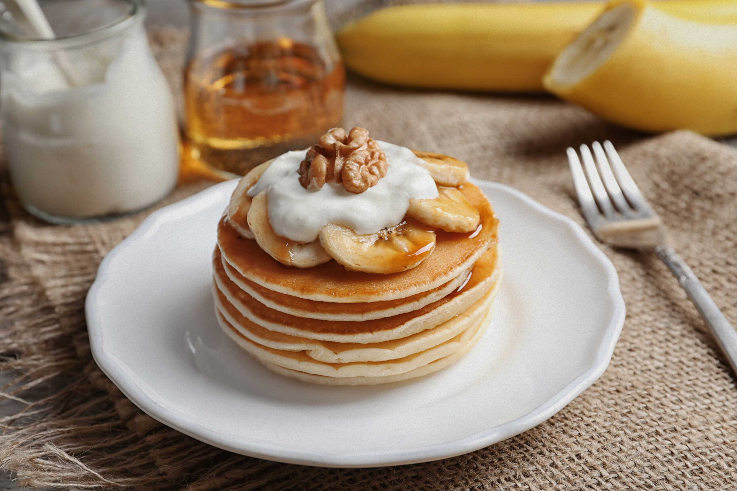 - Slice the bananas into long strips. Place a warm pancake on a plate and top with a spoonful of Greek yogurt and banana slices.
